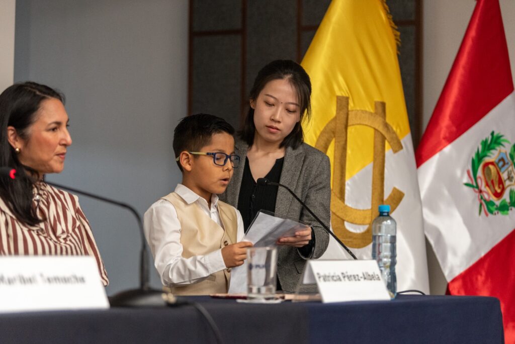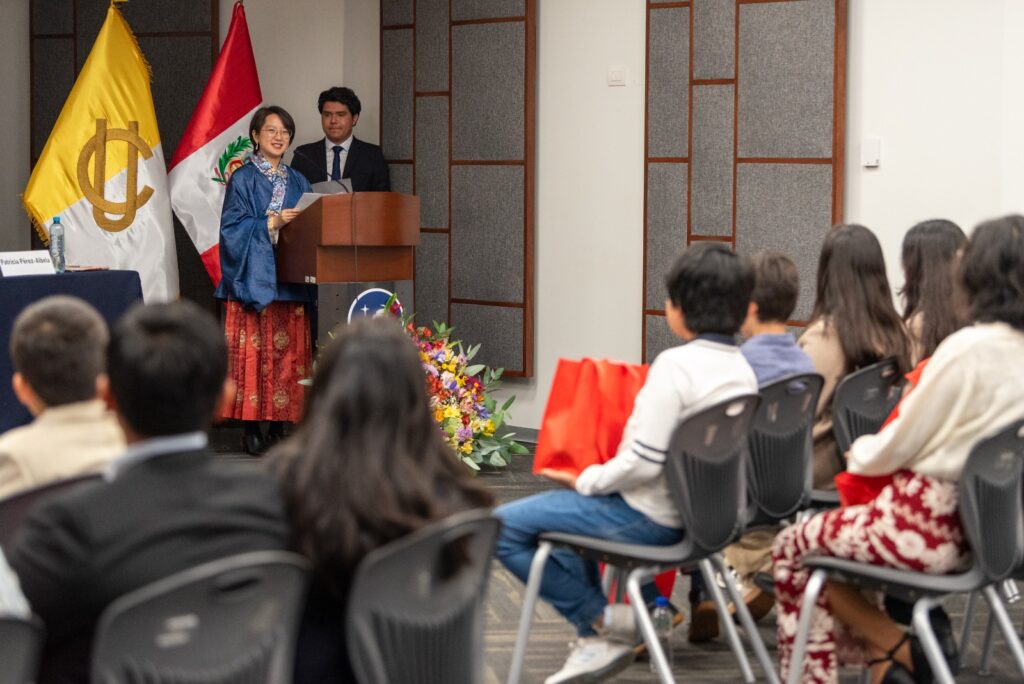 La ceremonia inició con la presentación de la mesa de honor, conformada por Maribel Temoche, directora del Instituto Confucio PUCP; Zhao Lihong, subdirectora china; y Patricia Pérez-Albela, coordinadora académica, quienes dirigieron palabras de reconocimiento a los estudiantes por su dedicación y constancia, subrayando la valentía que implica asumir el aprendizaje de un idioma tan complejo desde la infancia y expresaron un agradecimiento especial a los padres, cuyo acompañamiento resultó fundamental en el desarrollo académico de los niños.